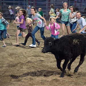 Some say the most entertaining sport in rodeo is the Calf Scramble in which kids ages 12 and under gather in the arena and prepare to match the speed of a herd of calves in order to acquire a ribbon tied to the tail of this out-manuvering, four-legged animal. When all the ribbons are then brought to the arena, the winners are announced and metals will be given for ultimate boasting rights.
